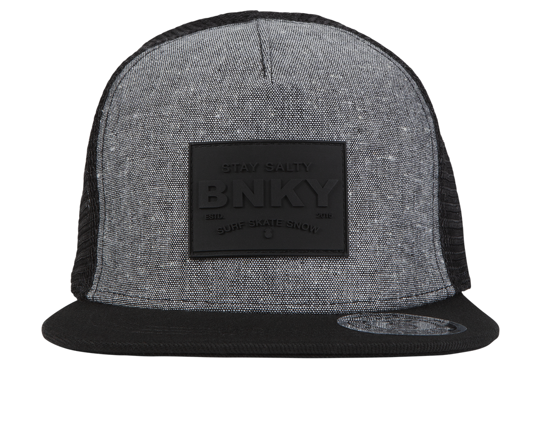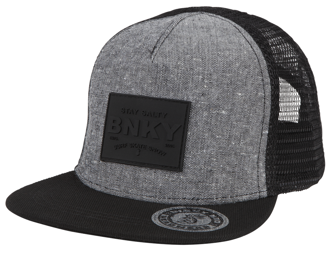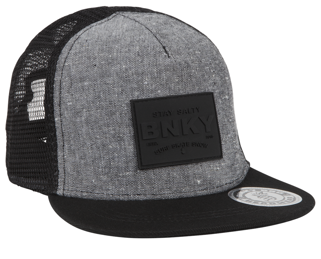 The BlackSand infant/baby, toddler, youth snapback hat has grey front paneling, black mesh paneling in back, a black bill, with a black "BNKY" patch in front.