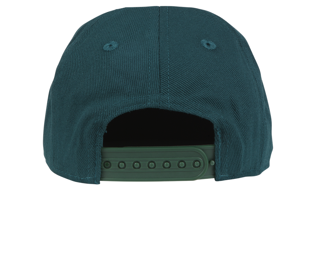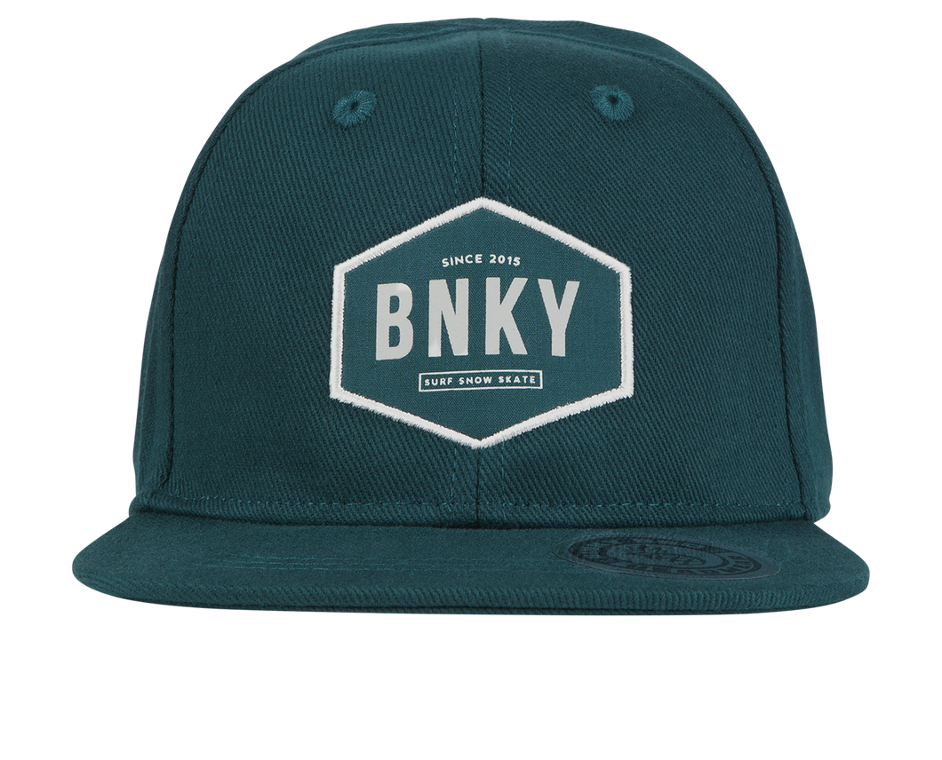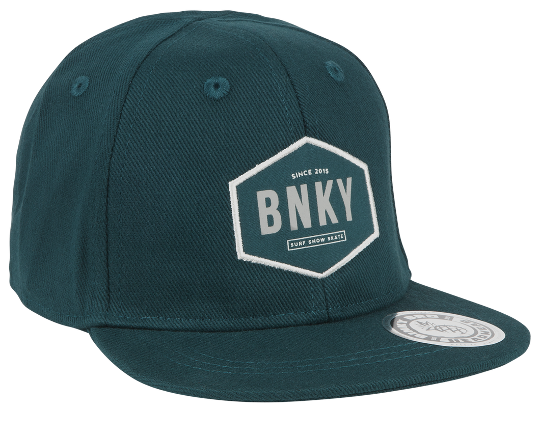 The Pacifica hat has a stitched "BNKY-SURF SNOW SKATE" patch on the front. All panels and the bill are made from a navy teal fabric. The back snap is a matching navy teal color. This hat comes in an infant, toddler, and youth size.