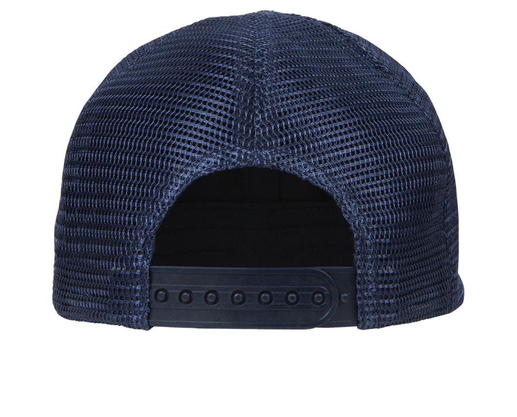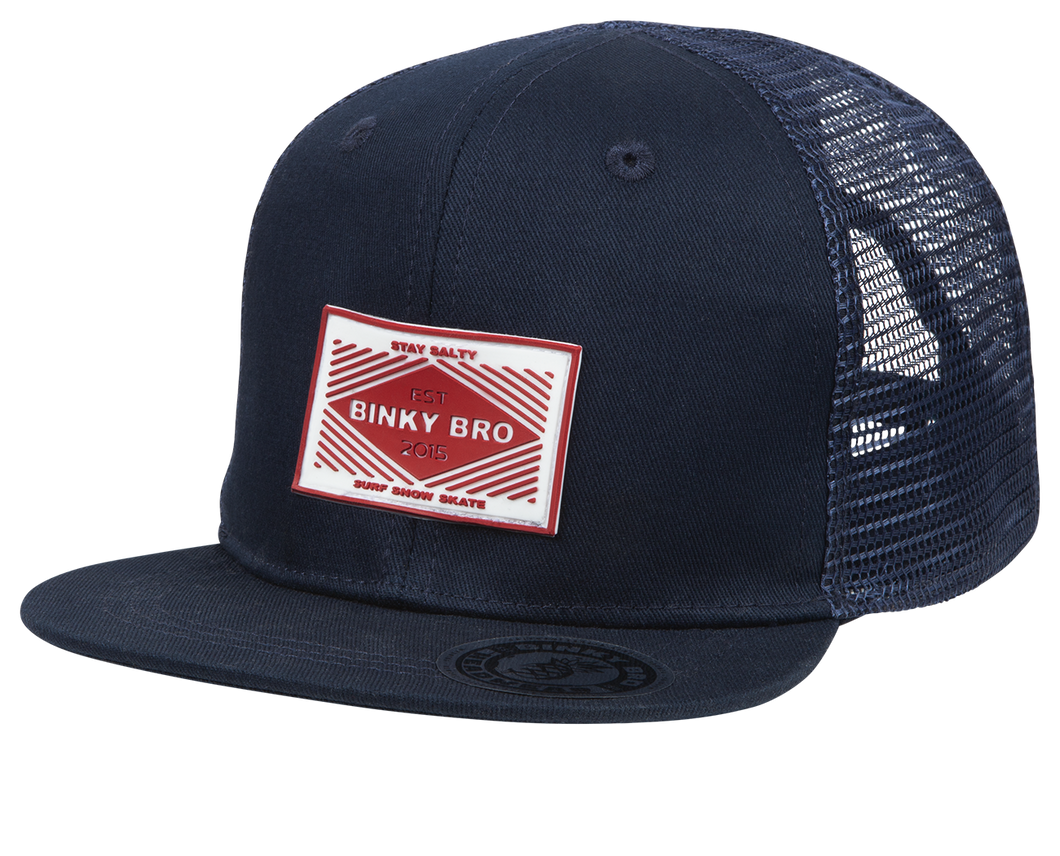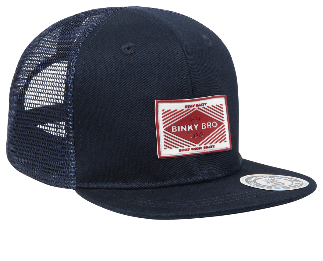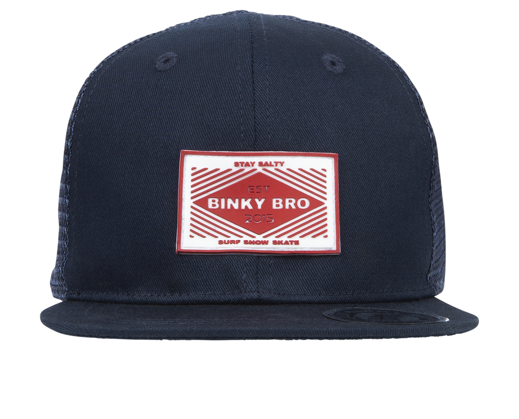 The Ponto hat has an embossed "Binky Bro - Surf Snow Skate" logo on the front. The front panels and the bill are a dark navy. The back panels are a dark navy mesh. The back snap is a matching navy color.