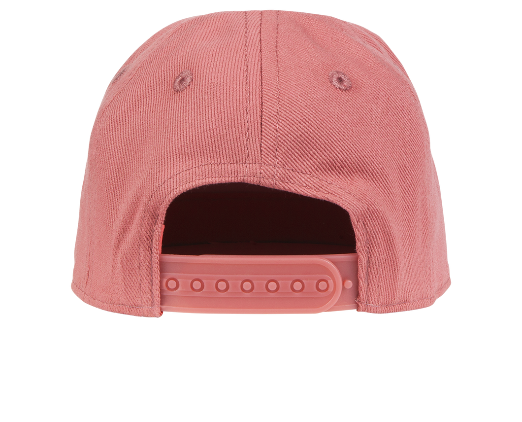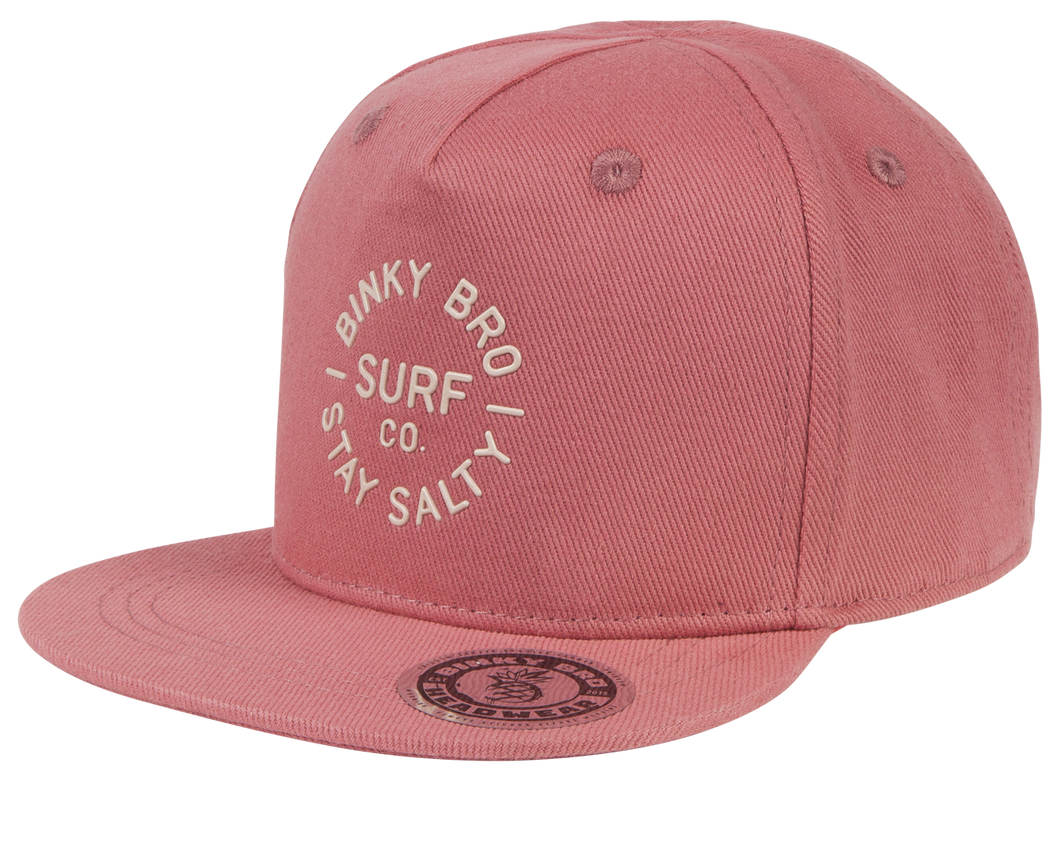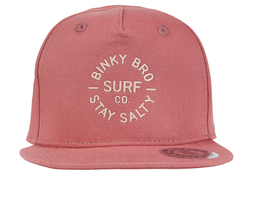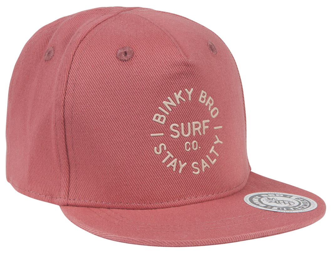 The Sunsets Cliffs hat has an embossed "Binky Bro Surf Co" logo on the front. All panels and the bill are made from a pinkish mauve twill fabric. The back snap is a matching mauve color. This hat comes in an infant, toddler, and youth size.