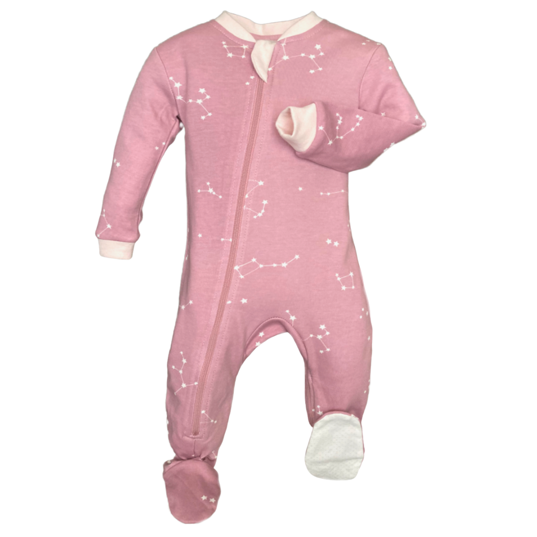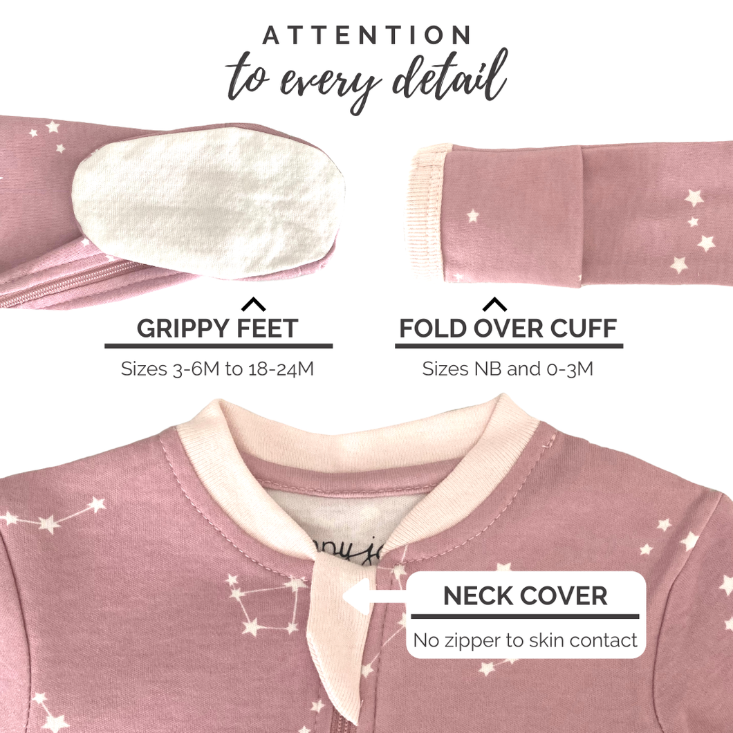 Front zipper for dressing and a separate inseam zipper for quick and easy diaper changes. Simple & intuitive design means no snaps and no cold air drafts - babies stay covered and comfortable. Premium GOTS organic cotton is eco-friendly, super soft, natural, sustainable & breathable. Little extra details like food-grade silicone on grippy foot bottoms (3-6M to 18-24M), no-scratch fold-over mitts (NB & 0-3M) and neck protector means the best product for your clients.