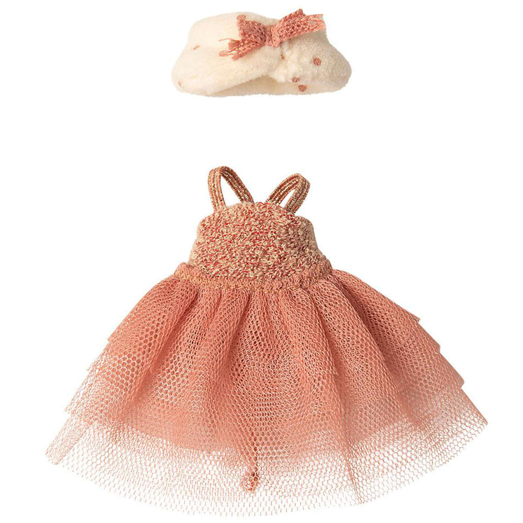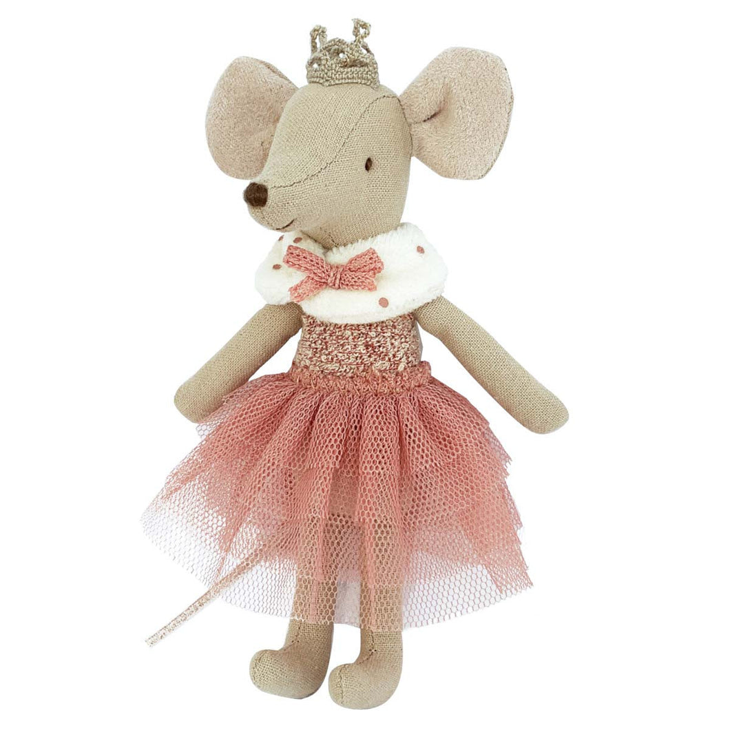 This lovely princess mouse is 5" tall, same height as other Maileg Big Sister Mouse dolls. She is dressed with a beautiful dress, a faux fur shawl, and a gold crocheted crown.