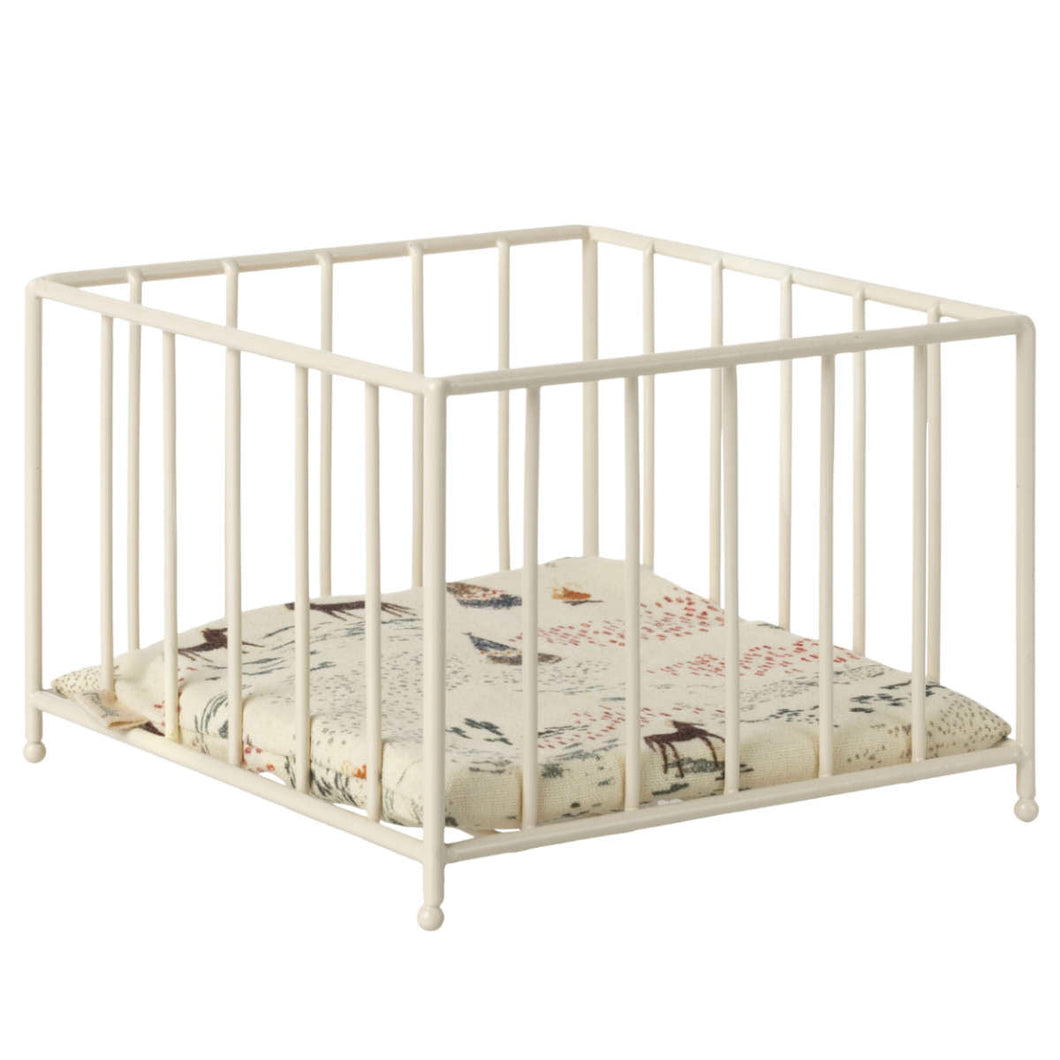 This Maileg MICRO size playpen fits bunnies/rabbits in size micro and teddy baby. It will keep the small family members safe, and you can use it for a small play area. It is made of metal and has a soft mattress at the bottom.
